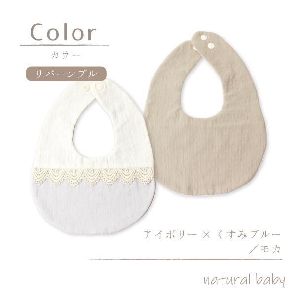 オーガニックコットン100%レース 綿100%生地、素材にこだわった日本製スタイ。長時間、数回に渡り揉み練り、芯からほぐれたナチュラルな表情とソフトでふんわりとした優しい肌触りをお楽しみいただける生地です。出産祝いなどのギフトにもおすすめです!