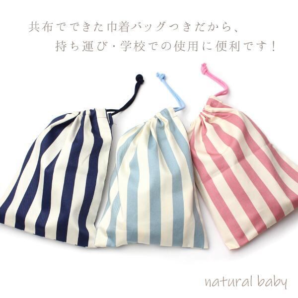 バッククロスタイプのエプロン。ひとりで簡単に着脱できるので、紐を結ぶのが苦手なお子様にオススメです。おそろいの柄の三角巾、巾着付き、それぞれの内側に名前が書けるタグが付いてます。