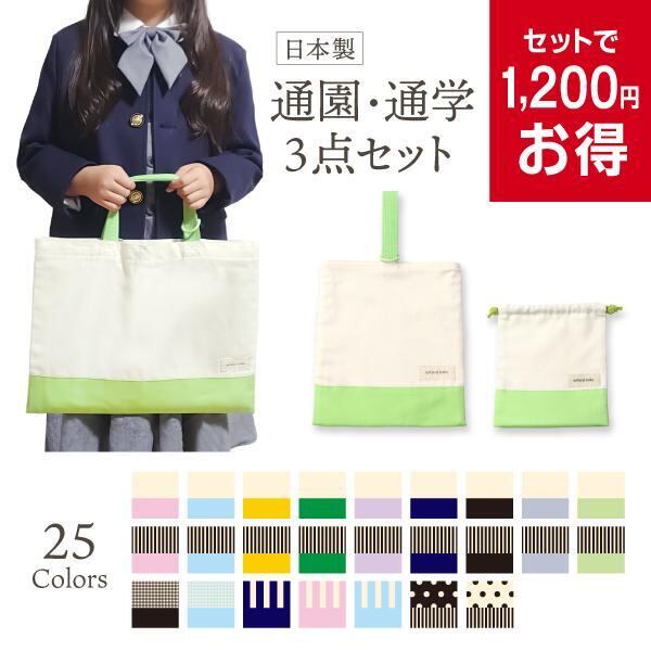 入園、入学準備に必須のアイテム3点セット。日本の自社工場で責任を持って製作しています。長くお使いいただきたいため、綿100%のしっかりした生地を使用しました。男の子も女の子も使えるように、色の組み合わせも多彩で全25種類ご用意しました。